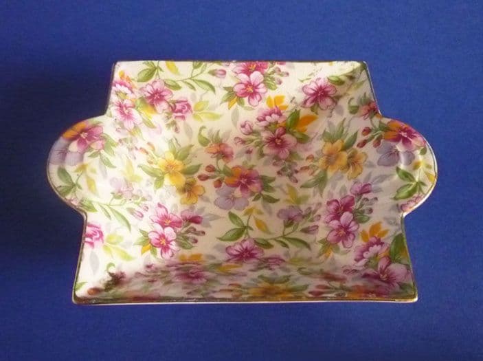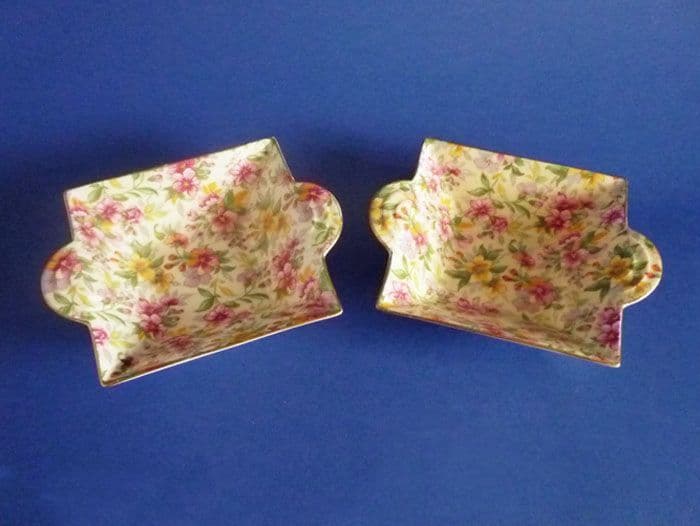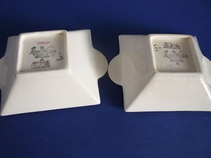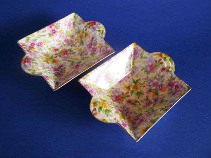 A lovely pair of square Estelle dishes with art deco tab handles. In good condition; no chips, cracks or restoration. Some crazing and one is slightly stained and appears a little darker. Nothing serious and nothing to detract - nice to get a pair. Printed Royal Winton marks and gold Canadian and Australian registration numbers. Width with handles 13.25cm (5.25in)