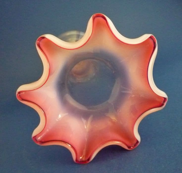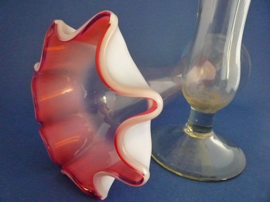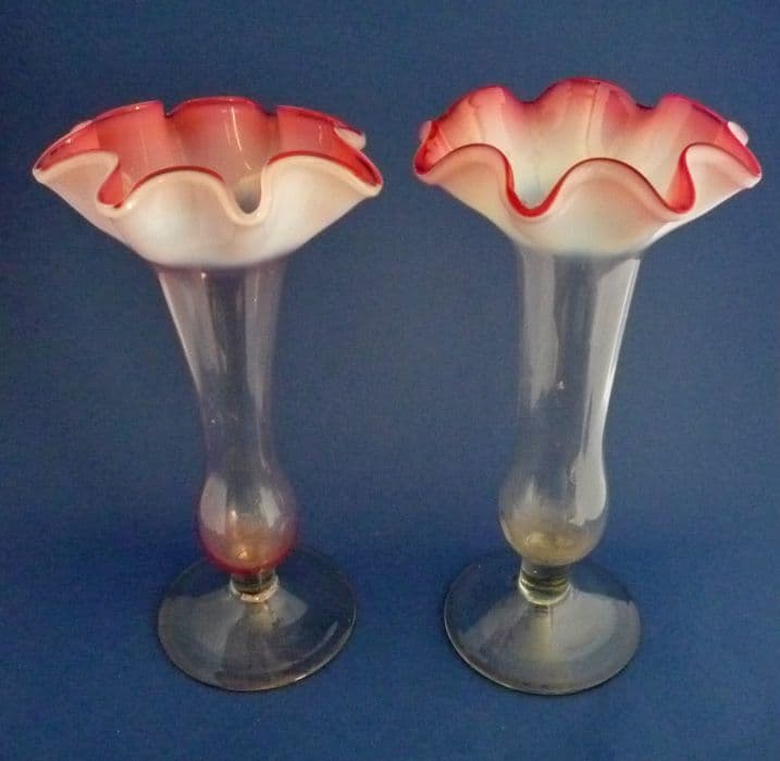 A lovely pair of handmade glass vases with a good depth of vaseline opalescence and cased cranberry around the rims which are finely ruffled to form a flower shape. In excellent condition - no chips, cracks or repairs. Slight variations in colour with some tool marks and inclusions, part of the manufacturing process and character of antique glass. Stourbridge, probably Stevens and Williams. Height 21.5cm (8.5in)