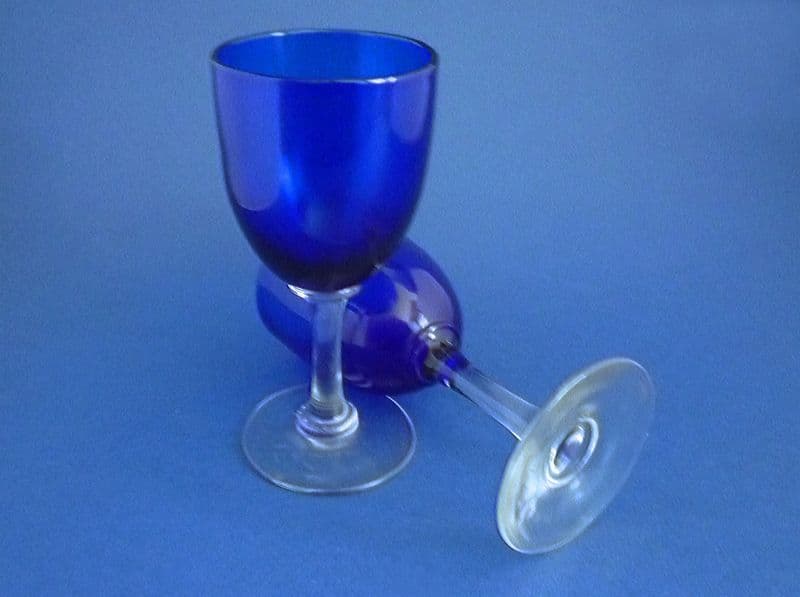 A fine pair of English clear stemmed wine glasses with Bristol blue bowls. Hand made and good depth of colour. In excellent condition - no chips or cracks and little sign of wear. Nice to get a pair. Height 12.25cm (4.9in), bowl diameter 5.75cm (2.25in)