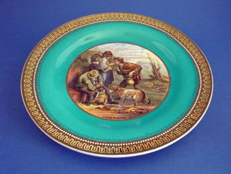 A lovely Prattware pottery plate finely printed with 'Lend a Bite' on a turquoise green surround. A humorous scene featuring a group of boys with a dog and pet monkey. In excellent condition - no chips, cracks or restoration and showing little sign of wear. The usual odd firing specks of kiln grit, but nothing to detract from this great example of early Victorian pottery. Diameter 18.25cm (7.1in)