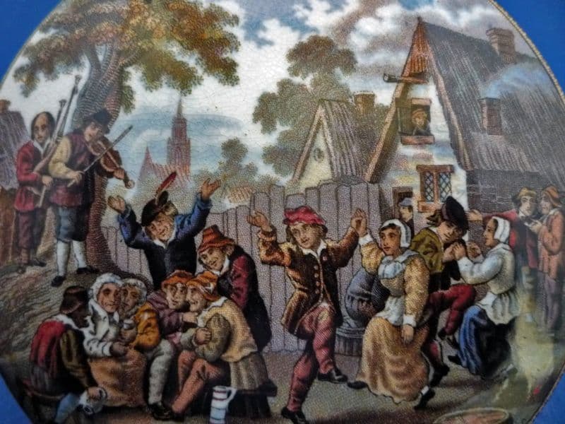 A finely printed Prattware pot lid depicting The Village Wedding after the famous painting by David Teniers. An earlier version with diamond registration on the jug in the foreground (15th January 1857). Good colours and in excellent condition - no chips, cracks or restoration. Titled 'The Village Wedding, Teniers Pinx'. Diameter 10.75cm (4.25in)
