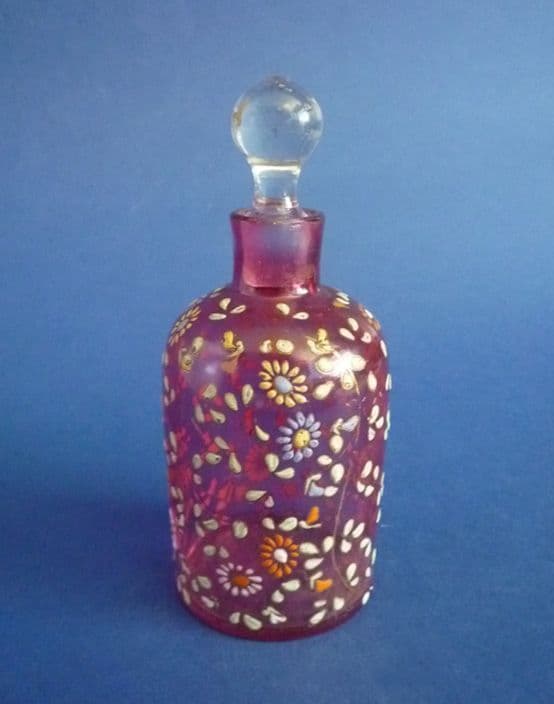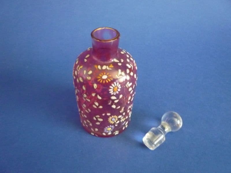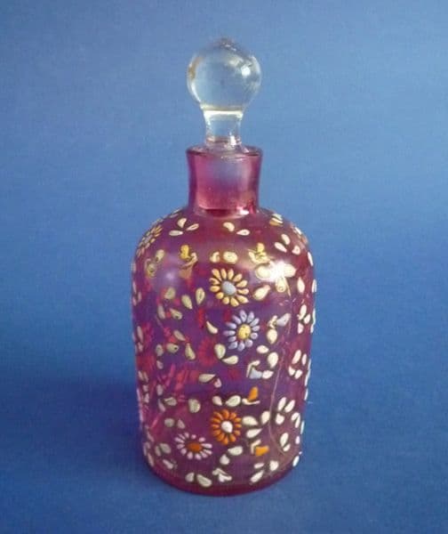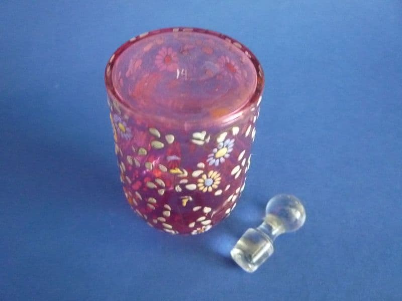 A lovely Victorian cranberry glass scent bottle with hand applied enamel sprays of flowers and trimmed with gold. A charming piece in excellent condition; no chips, cracks or repairs. Some age related wear to the gilding but nothing to detract. Rare to find in such good order, with original stopper. Circa 1880. Height 12cm (4.75in)