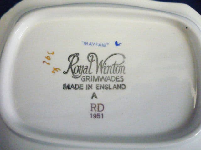 A lovely vintage Royal Winton 'Mayfair' art deco dish with pierced heart shaped handles. In excellent condition. The gilding is good and the transfer is nicely crisp. A stunning example with the old 1950's Royal Winton, Grimwades mark and Registration for 1951. Length 17.5cm (6.85in)