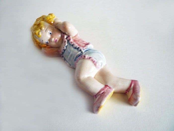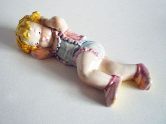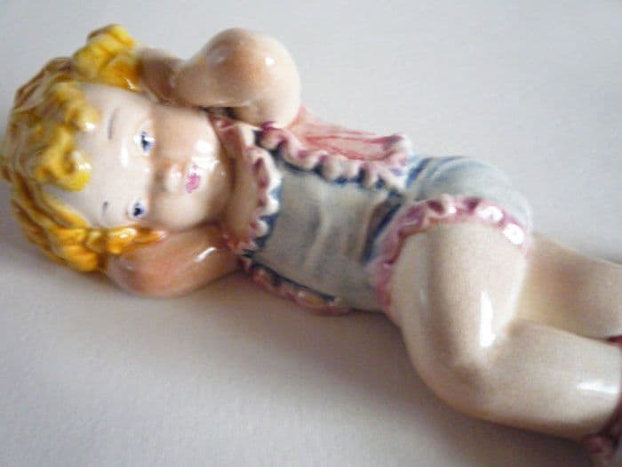 Sometimes called 'Cherub' or 'Child lying down', this pretty wall plaque was modelled by Miss Greaves and is quite a rarity. It features a blond curly haired little girl in a pink and blue playsuit. In excellent condition; no chips, cracks or restoration. Fine age related crazing typical of these wares, really only noticed on close inspection and nothing to detract from the display value of this lovely item. Printed 'Beswick Ware' mark and impressed model number 392. Length 15.25cm (6in)