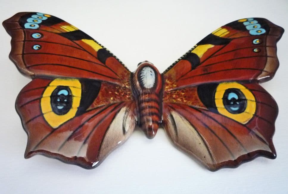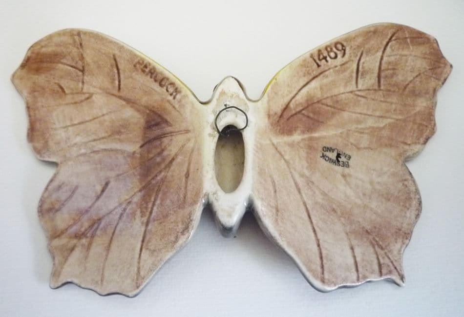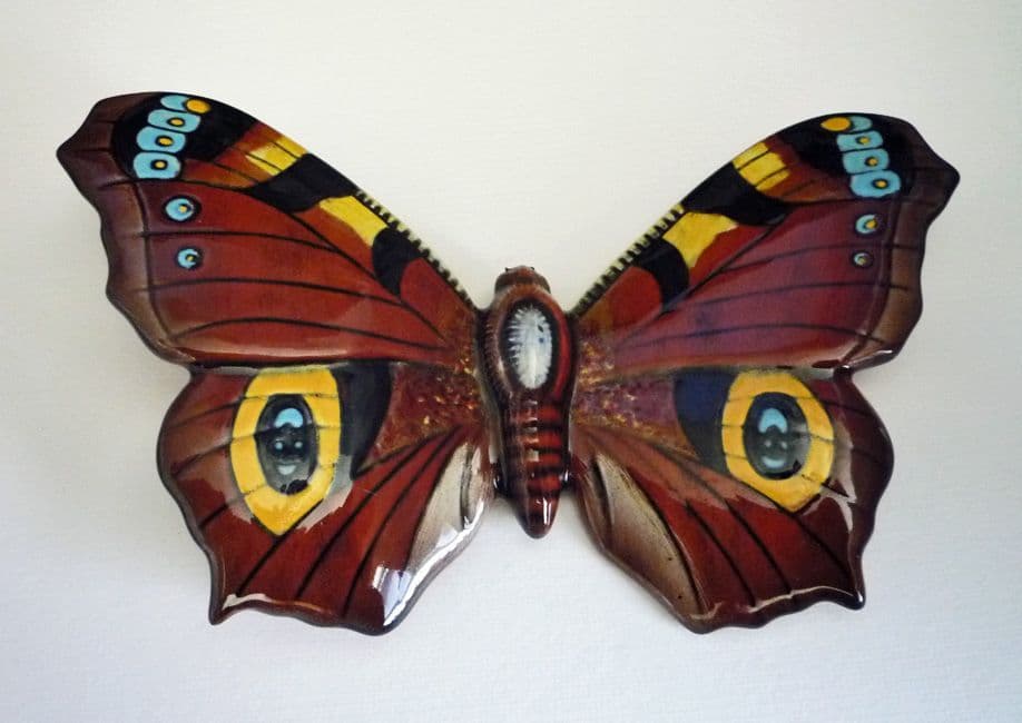 A rare vintage Beswick 'Peacock' butterfly wall plaque. Designed by Albert Hallam and produced in limited numbers, they are difficult to find especially in good order. Beautifully hand painted in bright naturalistic colours with a fine gloss glaze. In excellent condition - no chips, cracks or restoration. The original wire antennae are missing, but it still displays beautifully. Printed and impressed marks with BESWICK ENGLAND and model number 1489.