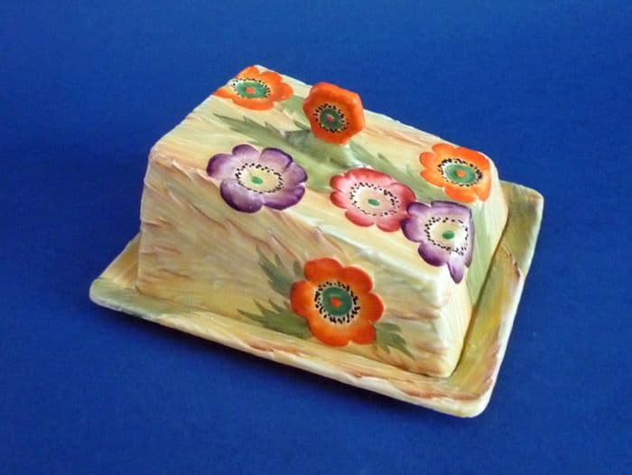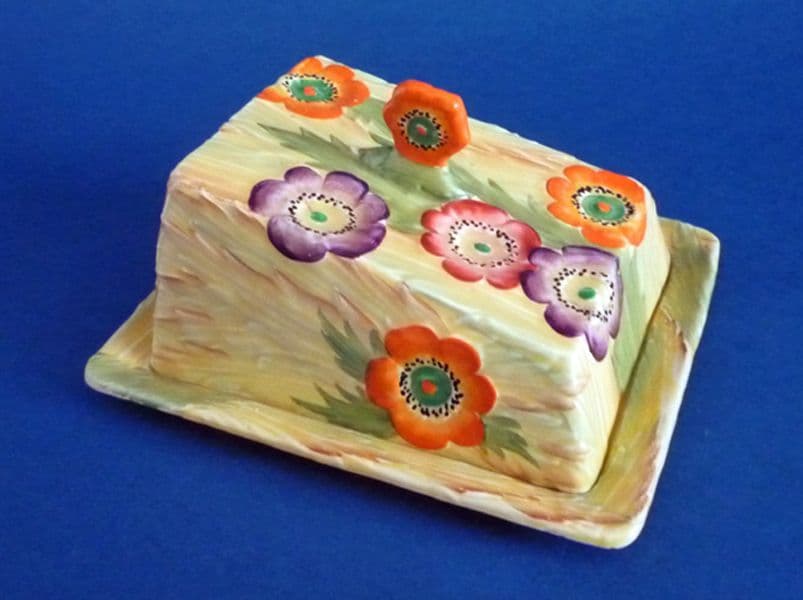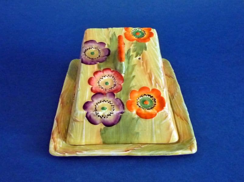 A lovely Carlton Ware anemone cheese dish hand painted with orange, purple and pink flowers on a yellow and green leafy background, an orange flower forming a finial on the cover. In excellent condition - no chips, cracks or restoration and showing little sign of wear. Rare to find especially in such good order. Carlton Ware script mark with Australian design application number 10804 and registration number 786475. Length of base 16.75cm (6.6in)