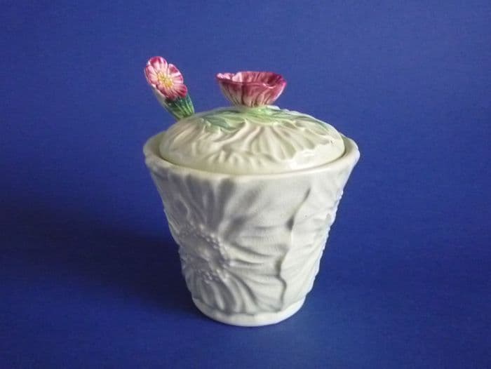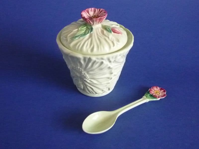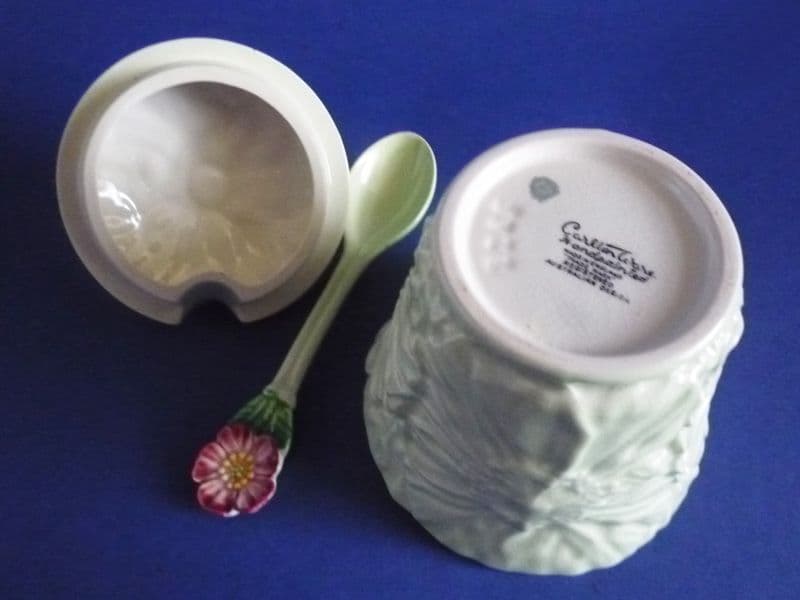 A lovely Carlton Ware 'New Poppy' preserve pot with original spoon. Good colours and in excellent condition. No chips, cracks or restoration. Rare to find complete and in such good order - looks like it's hardly been used. Full Carlton Ware script mark. Length of spoon 12.5cm (4.9in)