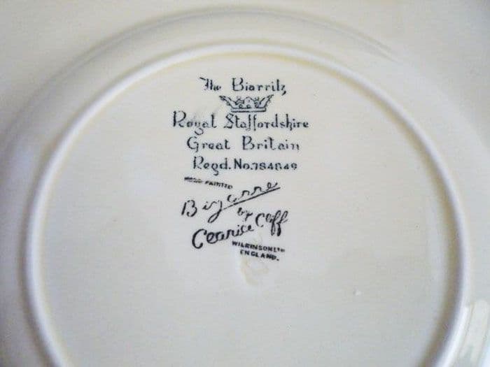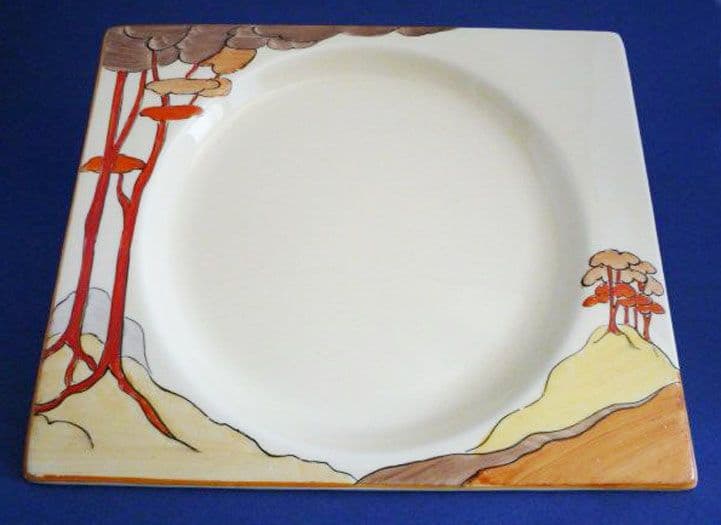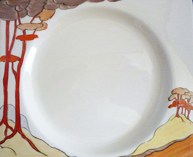 The Biarritz shape, although the epitome of art deco design, was difficult to fire as pieces tended to warp in the kiln and wastage was high. This lovely Bizarre 'Coral Firs' tea plate is unusual as most Biarritz plates seem to be in the large dinner size. Finely painted and in excellent condition; no chips, cracks or restoration. Lithographed signature 'Bizarre by Clarice Cliff, Wilkinson Ltd, England' and printed Biarritz mark with impressed date for 1934. Width 18.4cm (7.25in)