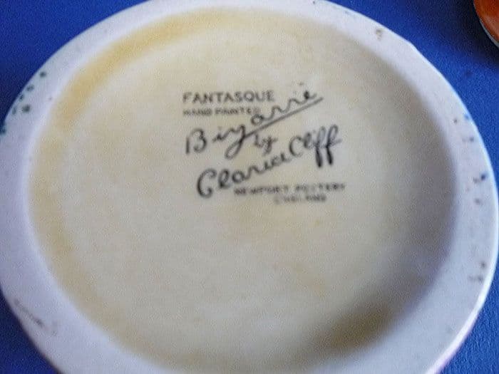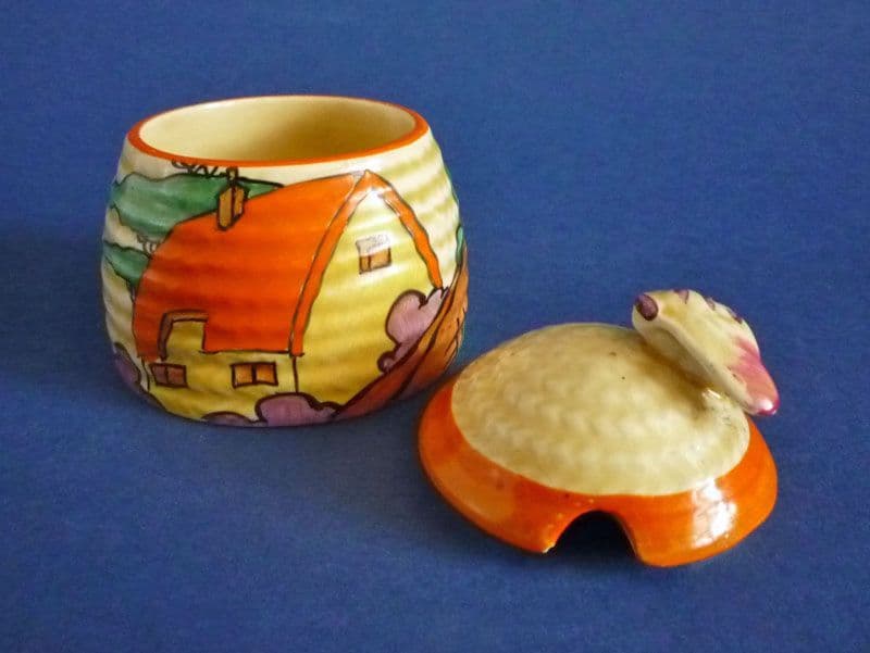 A superbly decorated small beehive honey pot in the rare 'Orange Roof Cottage' design. The full landscape, featuring a prominent cottage and bridge, is expertly painted with lots of bold brush strokes. A beautiful example in excellent condition; no chips, cracks or restoration and with the correct original lid. Signed FANTASQUE Bizarre by Clarice Cliff, Newport Pottery. Height with lid 7.5cm (2.95in)