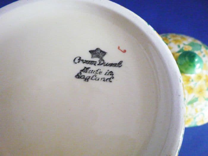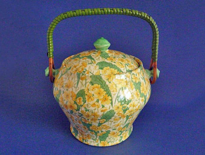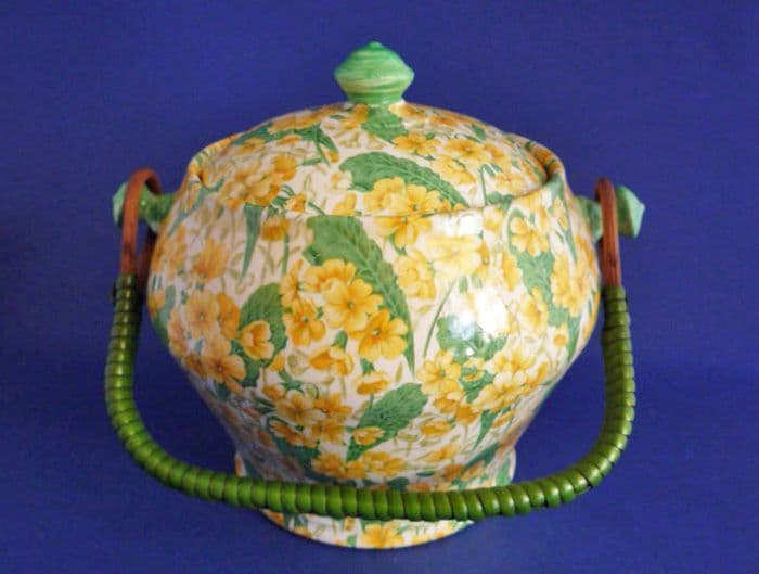 A superb Crown Ducal 'Primula' chintz biscuit barrel with painted green trim and original wicker handle. In great condition; no chips, cracks or restoration, it shows little sign of wear and really is a beautiful display item. A rare item to find. Crown Ducal backstamp. Height 15.2cm (6in)