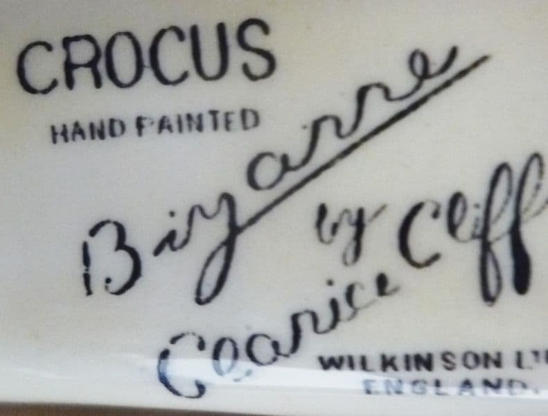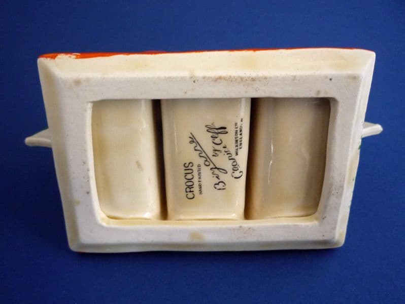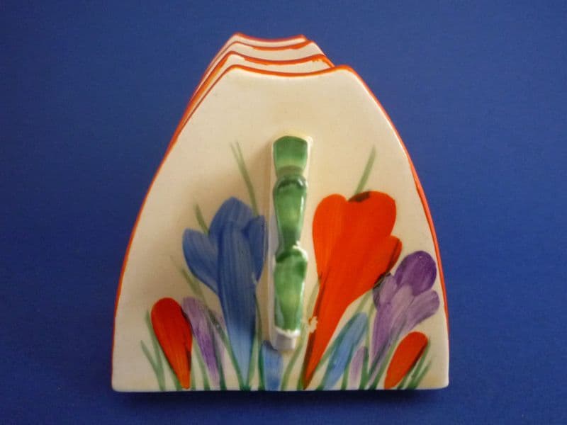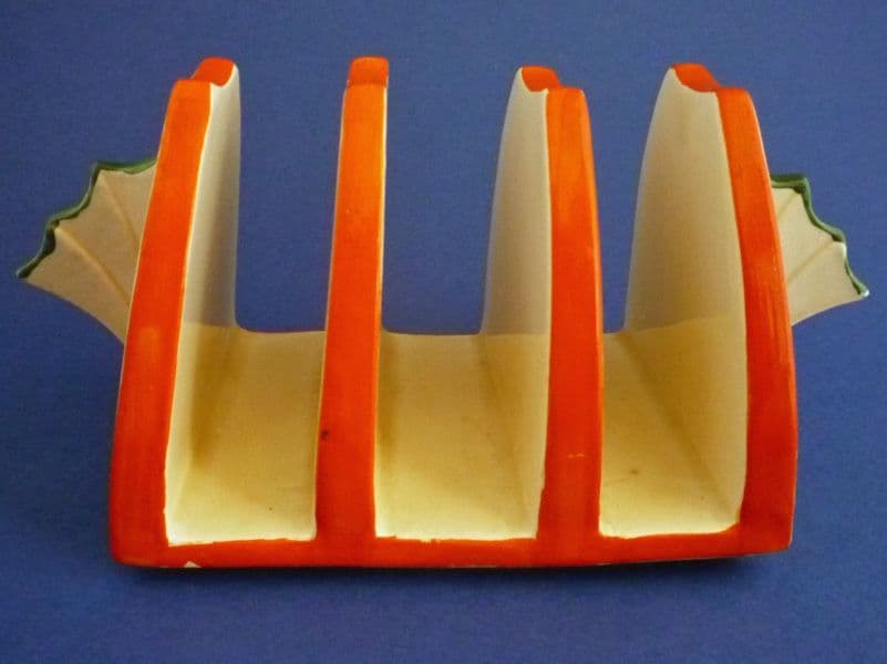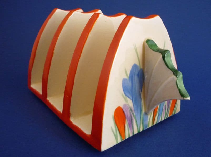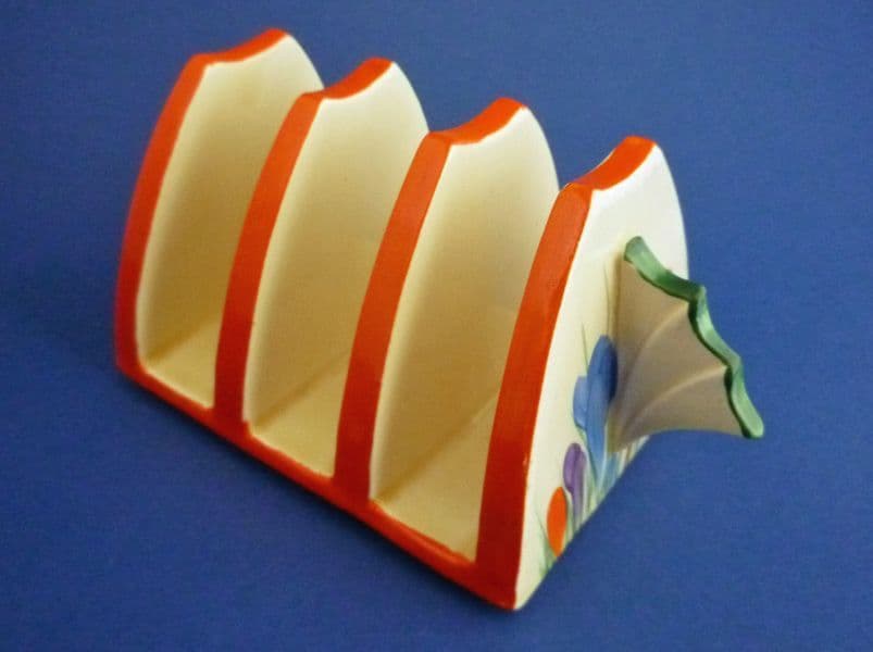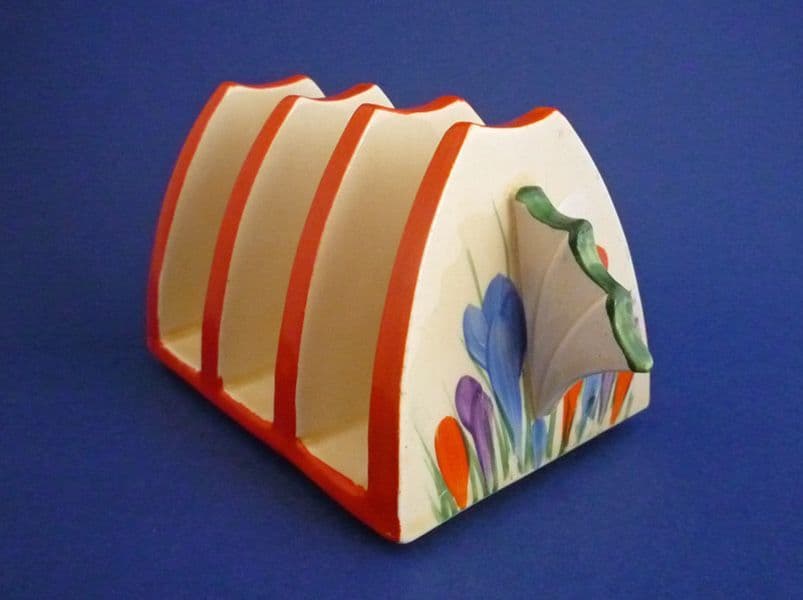 A lovely daffodil shape 477 toast rack finely painted with autumn crocus. The daffodil range was introduced in 1931 initially for floral designs and crocus works beautifully on this art nouveau inspired shape. In excellent condition - no chips, cracks or restoration. A rare piece to find, especially in such good order. Signed CROCUS Bizarre by Clarice Cliff. Overall length with fin handles 15.2cm (6in)