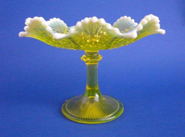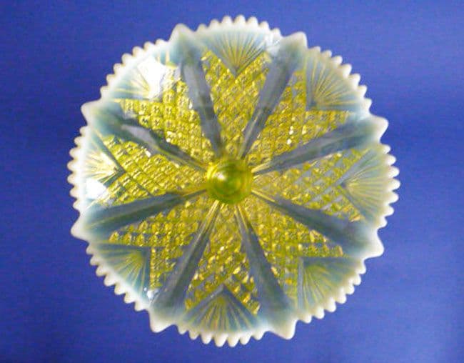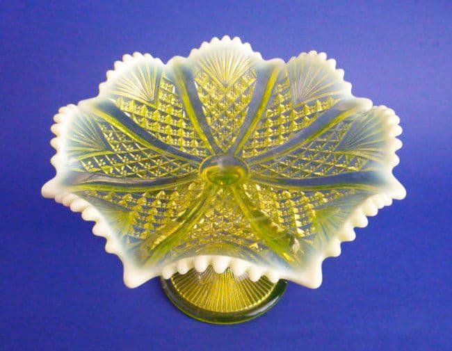 The very rare and highly collectible 'Queen's Crown' pattern was introduced by Davidson's in 1898. Produced in both blue and yellow (primrose) pearline, this large footed dish or comport in yellow is a stunning example. The deeply ruffled dish on a tall stem has a lovely depth of colour and the opalescence is beautifully done to allow this colour to shine through. In excellent condition, with crisp moulding and clearly marked 'Rd.320124'. Height 17.75cm (7in), diameter 24.5cm (9.6in)
