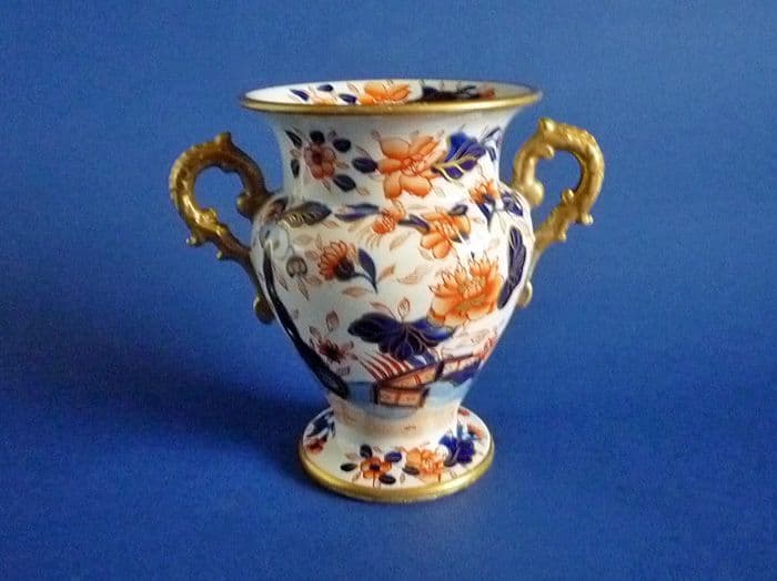 A superb Japan Fence pattern vase with scrolling snake handles. Printed in underglaze blue with the detail painted in iron red and gold. In excellent condition; no chips, cracks or restoration and showing little sign of wear. Rare to find vases of this period in such good order. Impressed two line MASON'S PATENT IRONSTONE CHINA. Height 12cm (4.75in)