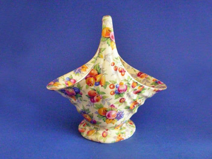 A lovely vintage Royal Winton Kew shape basket. In excellent condition; no chips, cracks or restoration. The gilding is good and the transfer is nicely crisp. Difficult to find these large baskets in such good order. A fine example with the old 1950's Royal Winton mark. Height 16.75cm (6.6in), width 17cm (6.75in)