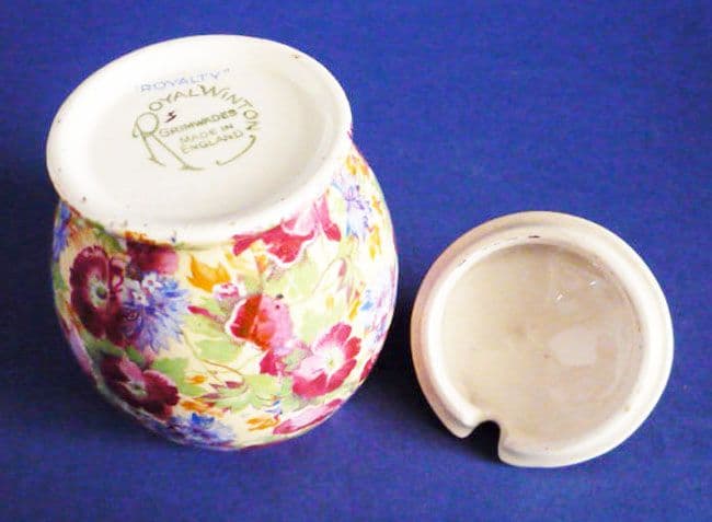 A lovely and rare vintage Royal Winton 'Royalty' chintz rosebud shape preserve pot with a beautifully molded lid; the shape is used more on pastel ranges than on chintz. In great condition and a fine example of the smaller size with vibrant colours and the old 'Royal Winton, Grimwades' circular art deco mark with impressed 'Rosebud'. Height 9.5cm (3.75in)