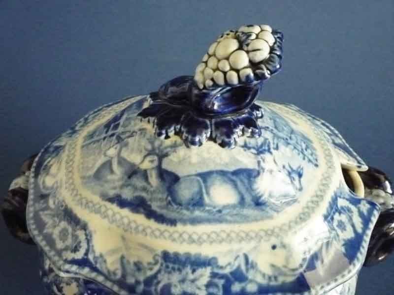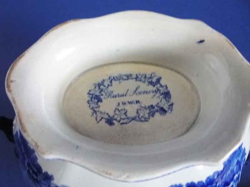 A superb Ridgways 'Rural Scenery' sauce tureen and cover with beautifully modelled rams head handles and cornucopia finial, hand painted in cobalt blue. The cover is printed in medium blue with one of the five known scenes which features a group of deer in a village setting. The base is printed both sides with an unrecorded scene of two men in the process of harnessing a horse to a cart, again in a village setting. In great condition; no chips, cracks or restoration. Some mild age related crazing and grey staining to the interior base, but nothing to detract from the display value of this rare item. Printed Rural Scenery J & W R in a grape vine cartouche. Height with lid 17.5cm (6.8in)