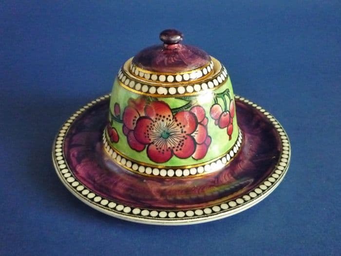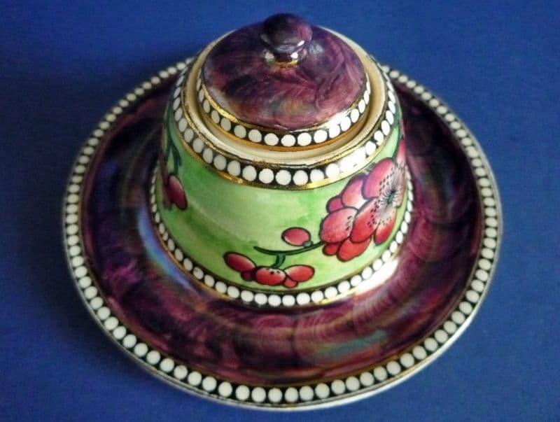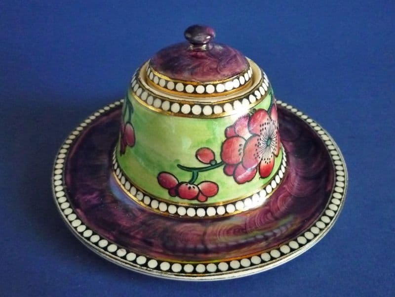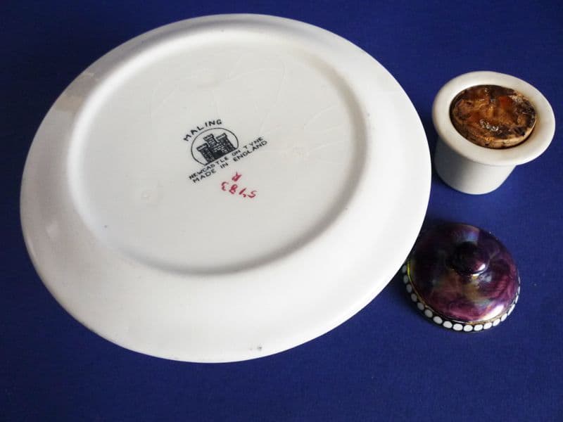 A superb Maling purple lustre 'beehive' inkwell hand painted with pink sprigs of may blossom on a band of green lustre. The original liner containing the ink still has its cork in place, which suggests it's hardly been used. In excellent condition - no chips, cracks or restoration. A rare item to find, especially complete and in such good order. Printed Maling mark and painted number 5783. Diameter of base 14cm (5.5in)