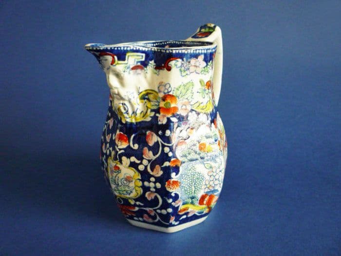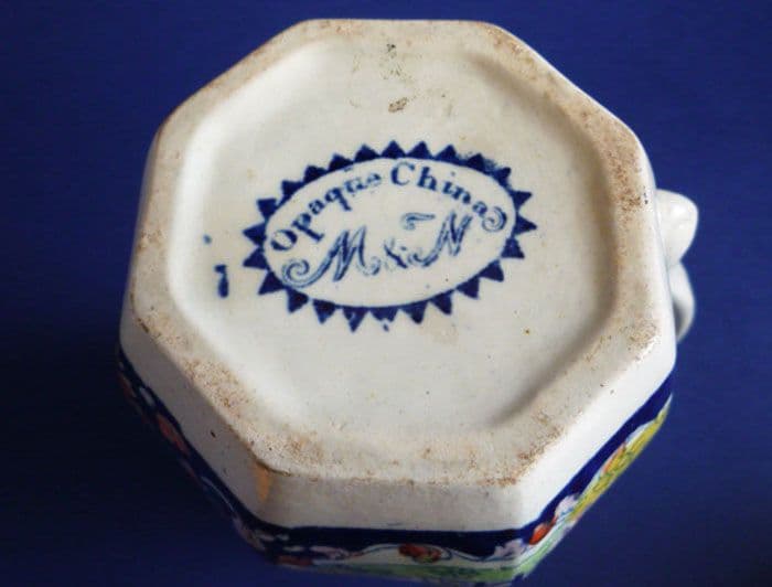 A fine quality 'opaque china' jug with moulded mask spout by Mayer and Newbold (fl.1817-1833). Printed in deep cobalt blue with chinoiserie garden and pavillion scenes, the detail enhanced with iron red, green and yellow enamelling. In great condition; no chips, cracks or restoration. Some minor age flaking around the rim, but nothing to detract from this lovely old jug. Printed 'Opaque China' and 'M & N' in oval cartouche. Height 12.5cm (4.9in)
