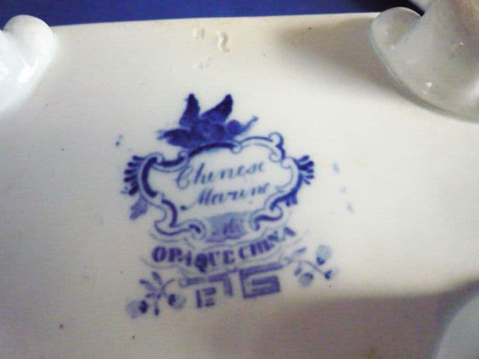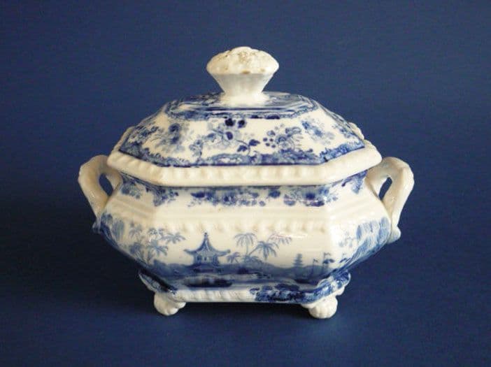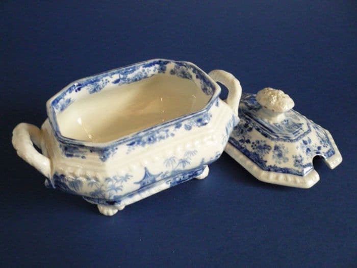 A lovely Minton octagonal sauce tureen with four lion's paw feet, scrolled handles and gadrooned edges. Finely printed in medium blue with an oriental scene of pagodas and figures in a harbour landscape. Part of the design is also printed inside the tureen base - a nice finishing touch. In excellent condition, showing little sign of wear apart from a couple of minor glaze 'rubs' to the finial. Rare to find, especially in such good order. Printed ''Chinese Marine' in a cartouche with a cursive 'M' and OPAQUE CHINA. Length with handles 17cm (6.7in)