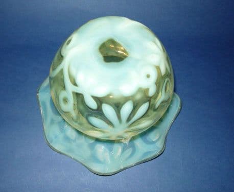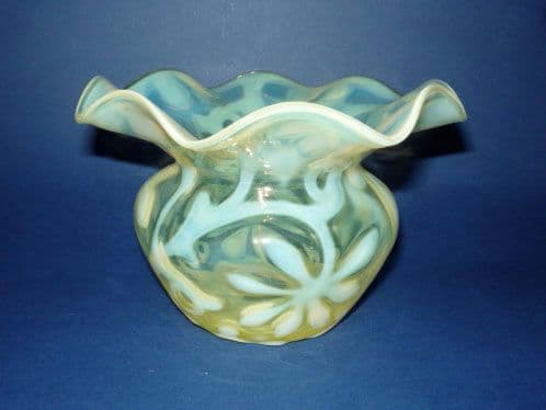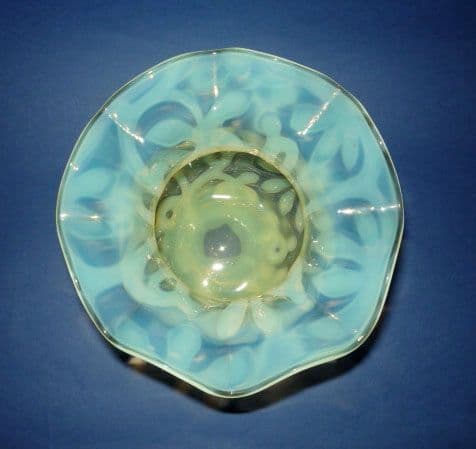 This beautiful vase is in the well known and highly sort after Horse Chestnut Leaf pattern by the old Stourbridge glassmaker Richardsons. Originally made for contemporary glass collectors, production was expensive because the designs were mould blown and the moulds had to be replaced often - a costly process. The uranium content had to be exact, to allow the glass to be malleable enough to be released from the moulds, and once released, the high points of the design re-heated to produce the 'vaseline' effect on the chestnut leaves. The rim was then crimped by hand to produce the ruffle and when cool the pontil mark polished smooth. In perfect condition - no chips, cracks or water stains. Height 10cm (4in), top diameter 14.5cm (5.7in)