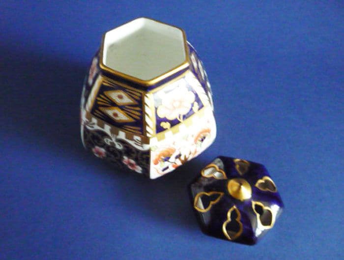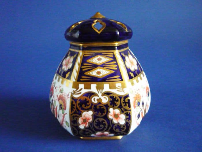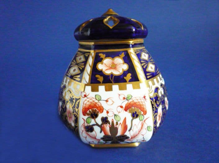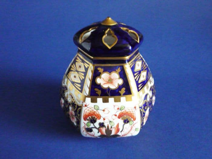 A superb antique Royal Crown Derby hexagonal potpourri vase with pierced cover. Finely painted in the Imari 'Witches' pattern 6299. In excellent condition; no chips, cracks or restoration and showing little signs of wear. A rare shape to find, especially in such good order. Both pieces with Royal Crown Derby mark and year code for 1911. Height 12cm (4.75in)
