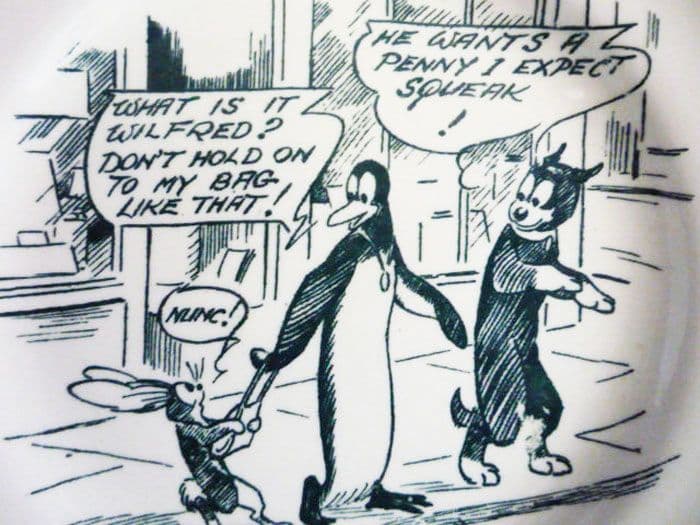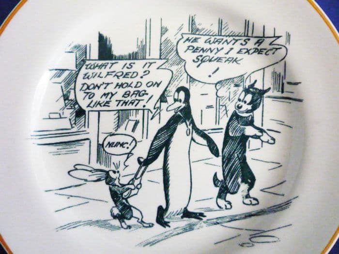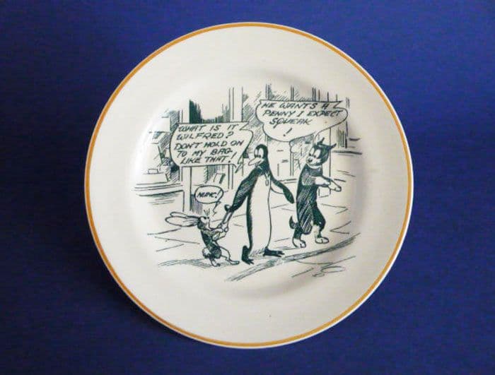 Based on the Daily Mirror comic strip, this Royal Doulton series was only produced from 1927 to 1935. Featuring Pip the dog, Squeak the penguin and Wilfred the rabbit created by Uncle Dick (B J Lamb) and drawn by A B Payne, this scarce tea plate shows scene three of five 'What is it Wilfred? Don't hold on to my bag like that!'. In excellent condition, not even crazed. Rare to find, especially in such good order. Printed Royal Doulton mark with Daily Mirror underneath and date impressed for December 1927. Diameter 16.25cm (6.4in)