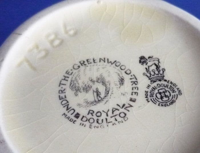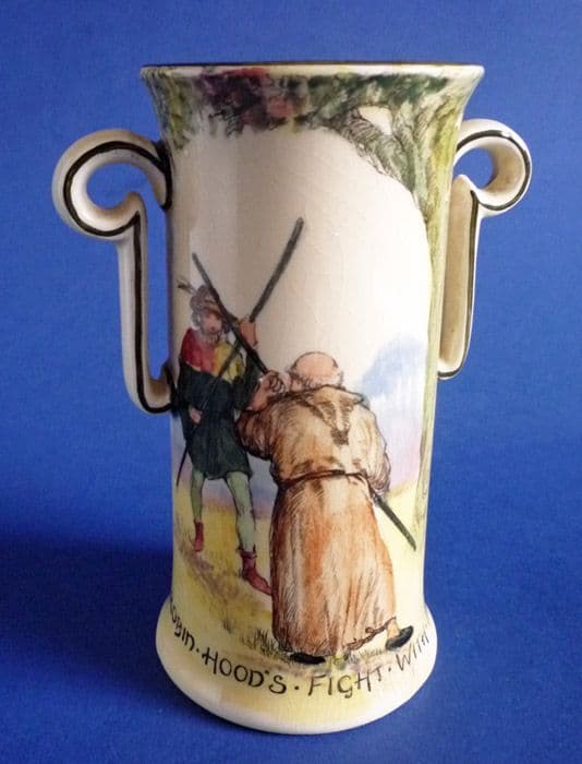 A lovely Royal Doulton 7386 shape vase from Under the Greenwood Tree series, featuring Robin Hood's fight with Friar Tuck. In excellent condition; no chips, cracks or restoration, although there is some fine age related crazing which is quite usual for this type of ware. Rare to find, especially in such good order. Displays beautifully. Special 'Under the Greenwood Tree' and Royal Doulton backstamps. Height 14cm (5.5in)