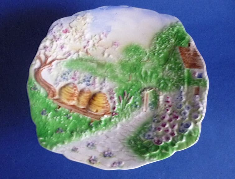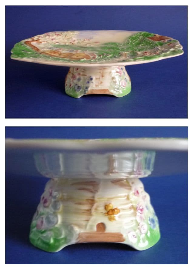 A stunning Royal Winton comport or cake stand featuring beehives in a country garden setting with hollyhocks, archway and thatched cottage - the foot modelled as a beehive with bees and flowers. In excellent condition - no chips, cracks or restoration. Some mild age related crazing typical of these wares, though nothing to detract. A rare item to find, especially in such good order. 'Royal Winton, A' mark. Width 20.75cm (8.2in)