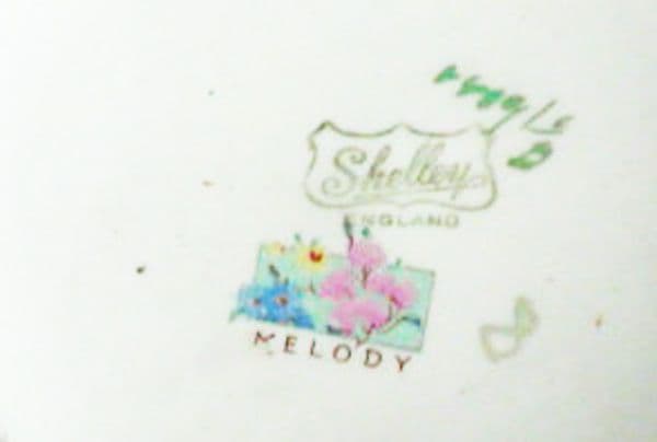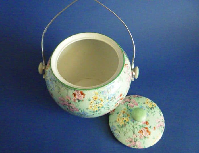A superb Melody chintz biscuit barrel with green trim. An early example in pottery complete with original chrome handle which clips on. In excellent condition; no chips, cracks or restoration. A beautiful display item, very rare to find especially in such good order. Printed Shelley and Melody marks with painted pattern number. Height with lid 16cm (6.25in)
