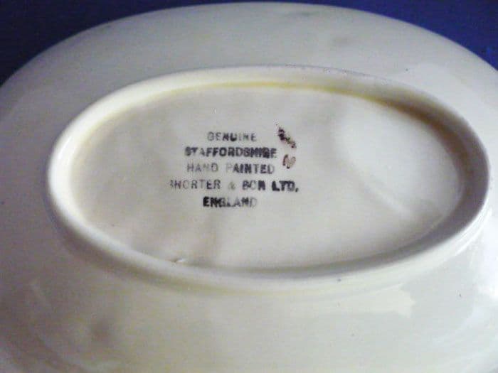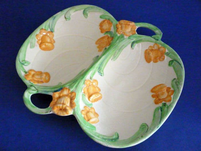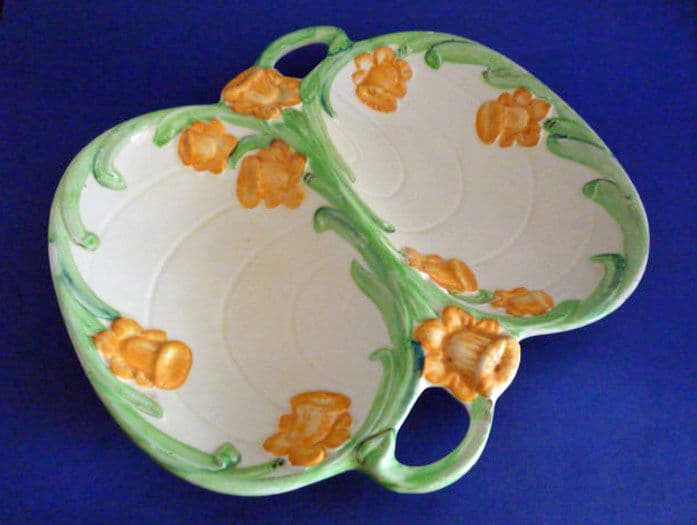 A lovely Shorter hand painted 'daffodil' double dish in a classic art deco shape. One of the most stylish of Shorter designs and difficult to find, especially in good condition like this one. No chips, cracks, crazing or restoration. Shorter and Son mark. Width 23cm (9in)