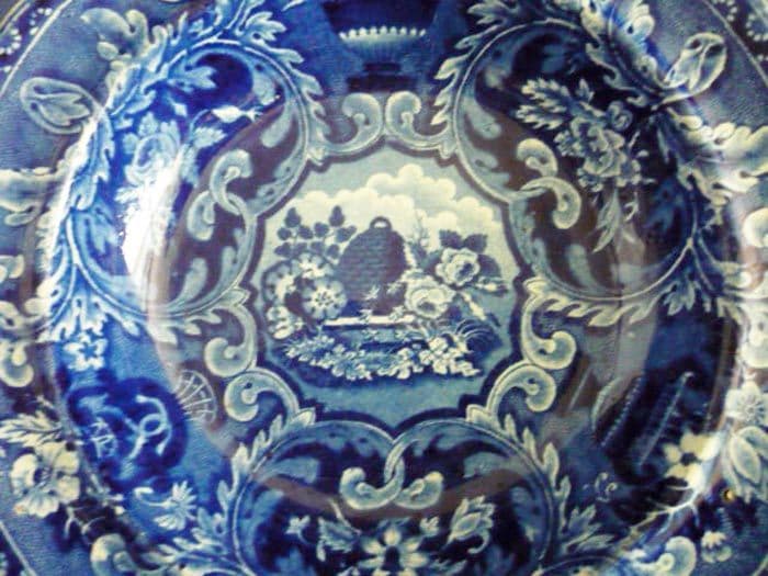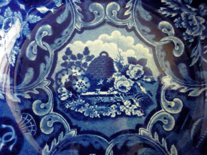 A superb dished soup plate printed in dark blue with the rare 'Beehive and Vases' pattern attributed to Stevenson and Williams. The central panel features a beehive or skep with bees and flowers; the wide border of flowers, scrolls and vases extending to this. In excellent condition with no chips, cracks or restoration. Minor old frit to the foot rim and a few barely noticeable surface scratches. Mentioned for accuracy really as it's still a beautiful display item. Diameter 25.25cm (10in)