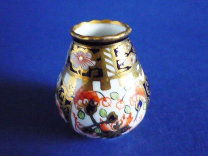 A rare piece of Victorian Royal Crown Derby in the form of a miniature vase. Finely painted in the Imari 'Witches' pattern 6299. In excellent condition; no chips, cracks or restoration and showing little signs of wear. A true miniature and scarce to find, especially in such good order. Royal Crown Derby mark and year code for 1897. Height 3.5cm (1.4in)
