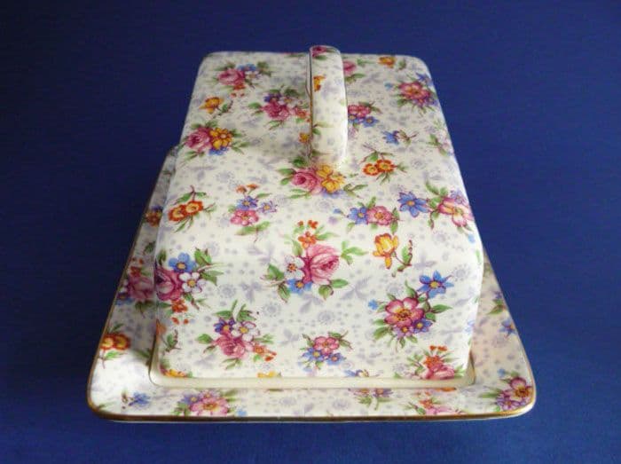 A superb Royal Winton 'Eleanor' Dane shape cheese dish and cover in excellent condition. Many old cheese and butter dishes have underglaze staining, but this one is very clean. In great condition; no chips, cracks or restoration. A fine example; rare to find, especially in such good order. 'Royal Winton, Grimwades' mark. Length of base 16cm (6.3in)