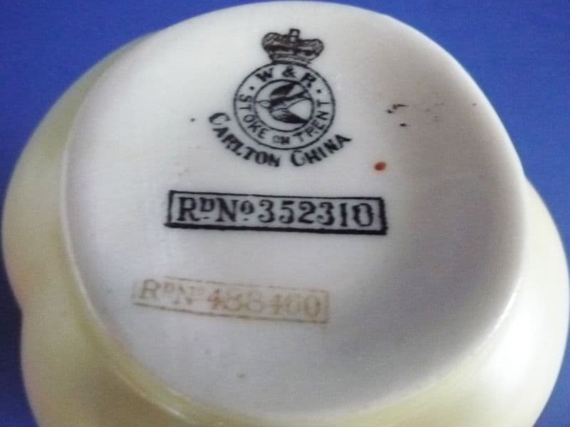 A lovely blushware sugar sifter hand painted with heather blooms in purple, pink and yellow framed with floral garlands. An elegant shape in excellent condition - no chips, cracks or restoration. Printed W & R Crown and Bluebird mark with Carlton China and registration numbers 352310 and 488460 for 1906. Height 15cm (5.95in)