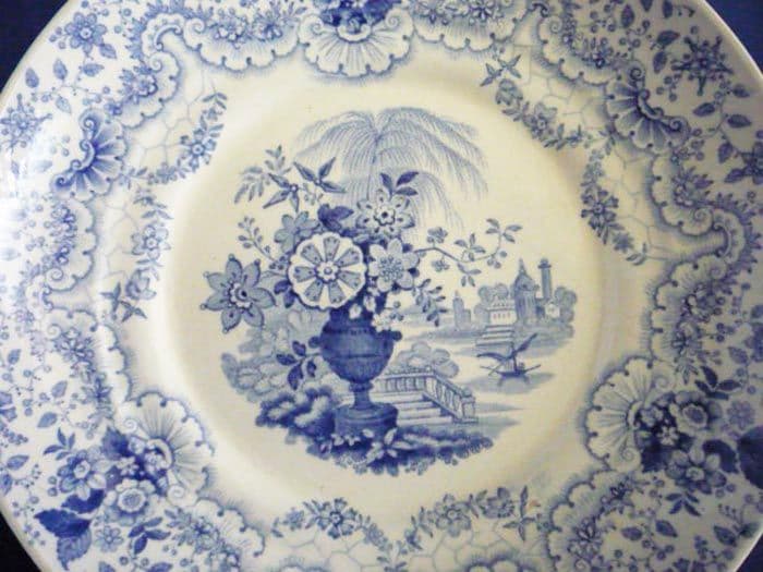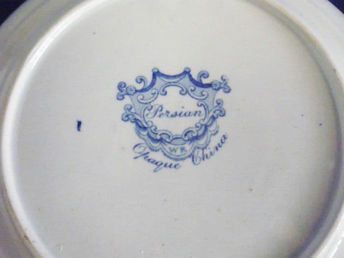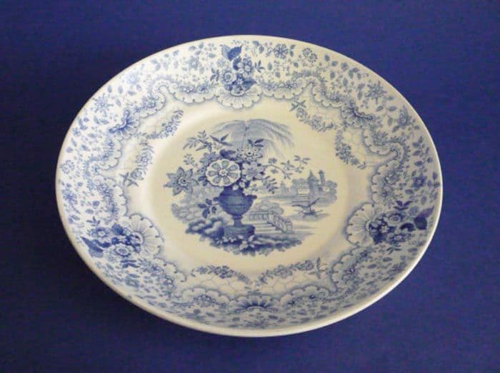 A finely potted round dish by William Ridgway, printed in light to medium blue with a prominent flower urn and a Persian townscape with domes and minarets in the background. Framed with a pretty border of flowers and shell scrolls. In excellent condition; no chips, cracks or restoration. Printed 'Persian' in a scrolled cartouche with WR and Opaque China. Diameter 17cm (6.75in)
