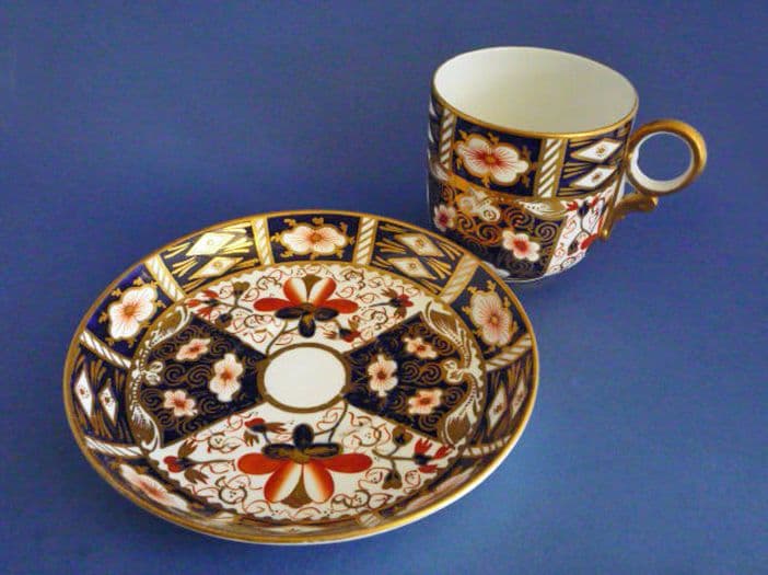 A superb 'Traditional Imari' pattern 2451 tall breakfast cup and saucer decorated in iron red, cobalt blue and 22 carat gold. Lovely scroll and loop handle. In excellent condition; no chips, cracks, restoration or wear. Rare shape and size to find, especially in such good order. Royal Crown Derby marks with year codes for 1910. Diameter of saucer 15.7cm (6.1in), height of cup 8cm (3.1in)