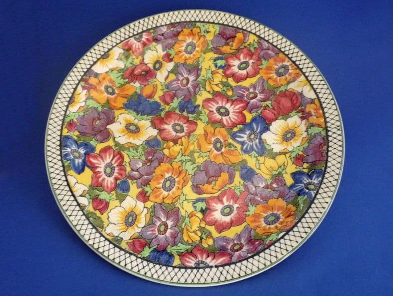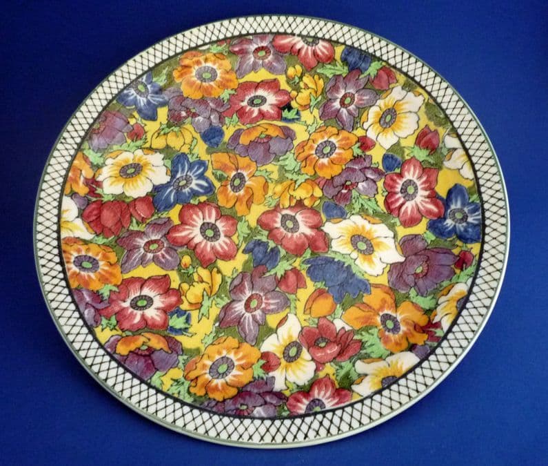 A lovely Royal Doulton 'Anenomes B' series ware rack/display plate covered in brightly coloured flowers with a black & white cross hatch patterned border. Shown to great effect on a shape which emphasizes the stunning quality of this vibrant design. In excellent condition - no chips, cracks or restoration and showing little sign of wear. Royal Doulton backstamp with series reference D5856 and impressed date for October 1938. Diameter 26.5cm (10.4in)