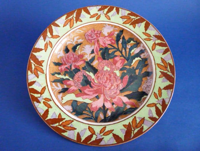 A lovely 'Waratah E' series ware plate, the series produced briefly between 1932 and 1938. Block printed with vivid cerise and pink flowers framed by a border of leaves on a pale green ground. In excellent condition; no chips, cracks or restoration. Rare to find, especially in such good order. Printed Royal Doulton mark with series number D5207 and date impressed for June 1934. Diameter 25.75cm (10.1in)