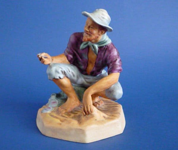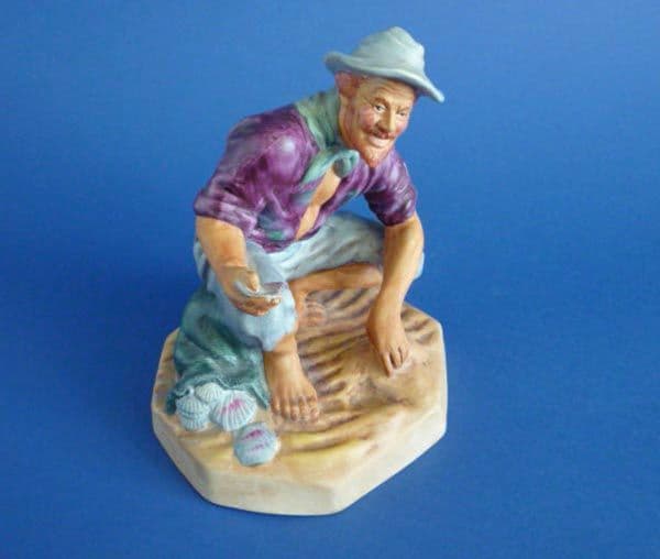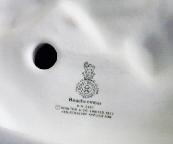 A fine character study entitled 'Beachcomber' and designed by Mary Nicholl. A bearded figure sits on a sack of scallop shells as he examines his latest find. Richly coloured with shot enamels which give a silky matt finish to the glaze. Issued between 1973-1976, it's a first quality item in excellent condition. Printed Royal Doulton mark with registration applied for. Height 16.5cm (6.5in)
