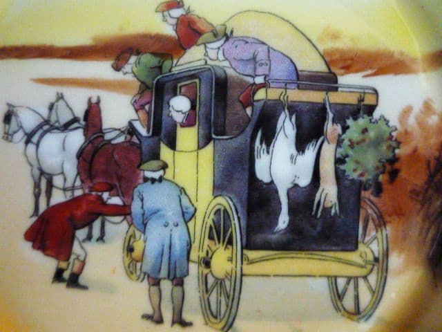 A small teaplate size Royal Doulton rack plate depicting tightening the harness with goose and hare hanging from the coach rear (yellow coach version). Designed by the illustrator Victor Venner (fl.1904-24). Bone china series number E3804. An unusual size and in excellent condition. Lion, crown and circle mark and impressed date for 1927. Diameter 16.5cm (6.5in)