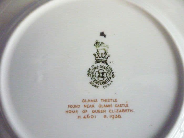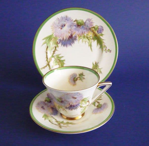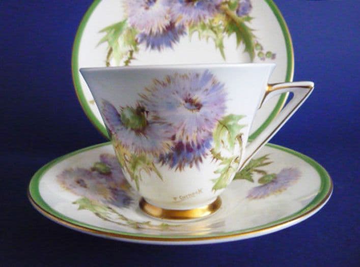 A lovely art deco bone china trio by Royal Doulton in 'Glamis Thistle' designed by Percy Curnock*, each piece with his facsimile signature. Delicately printed in shades of green, purple, yellow and brown with sprays of thistles which grow near Glamis Castle in Scotland, the childhood home of the late Queen Mother. Trimmed with green and gold, the cup with triangular handle. In excellent condition; no chips, cracks or restoration and showing little sign of wear. Printed Royal Doulton marks and the inscription: 'GLAMIS THISTLE FOUND NEAR GLAMIS CASTLE HOME OF QUEEN ELIZABETH'. H4601 and R1938. Date codes for 1938. Diameter of plate 17.5cm (6.9in)