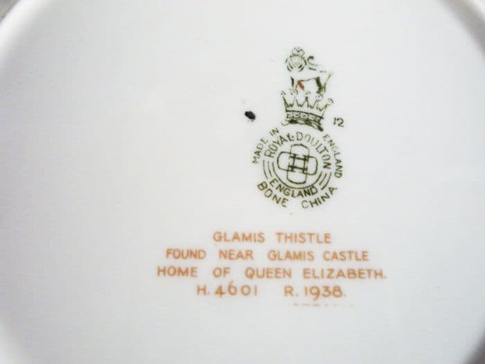 A lovely art deco bone china trio by Royal Doulton in 'Glamis Thistle' designed by Percy Curnock*, each piece with his facsimile signature. Delicately printed in shades of green, purple, yellow and brown with sprays of thistles which grow near Glamis Castle in Scotland, the childhood home of the late Queen Mother. Trimmed with green and gold, the cup with triangular handle. In excellent condition; no chips, cracks or restoration and showing little sign of wear. Printed Royal Doulton marks and the inscription: 'GLAMIS THISTLE FOUND NEAR GLAMIS CASTLE HOME OF QUEEN ELIZABETH'. H4601 and R1938. Date codes for 1938. Diameter of plate 17.5cm (6.9in)