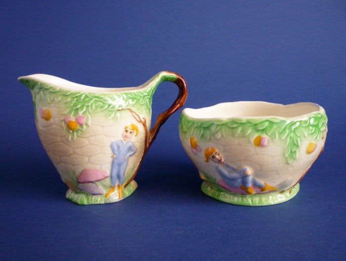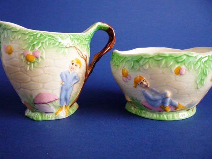 A lovely vintage Royal Winton jug and bowl with blue pixies on a pastel background. Both in excellent condition; no chips, cracks or restoration. Rare to find a matching pair, especially in such good order. Printed 'Royal Winton A' marks. Height of jug 9cm (3.55in)