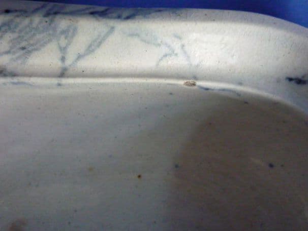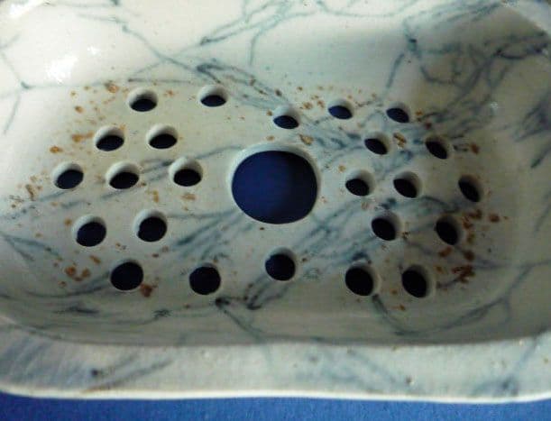Manufactured by Bell and Co. of Glasgow from the 1840's onwards, marbled wares were produced with various different colour veins; this one in blue. Rare to survive intact, the three pieces making up this covered soap dish and drainer are in great condition. The lid is perfect; the drainer has kiln grit in the glaze (see image 3), but no chips or cracks; the base has one minute chip which is hidden by the drainer (see image 4). A charming piece of early Scottish pottery. Length 14.75cm (5.75in)