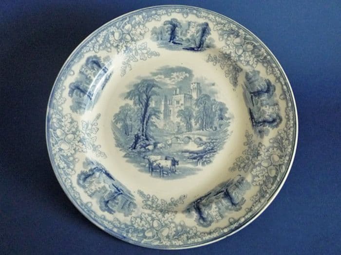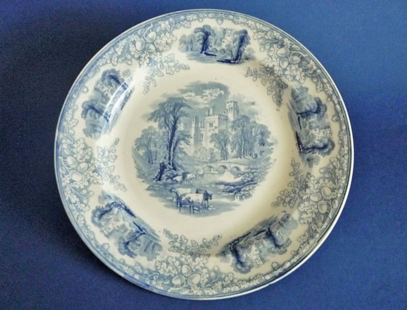 A fine Scott Brothers of Sunderland plate printed in medium blue with a romantic view of Haddon Hall in Derbyshire. The central view is framed by a lovely border of acorns and oak leaves inset with five smaller views of this famous old house.