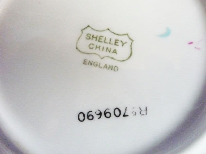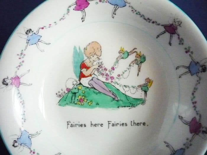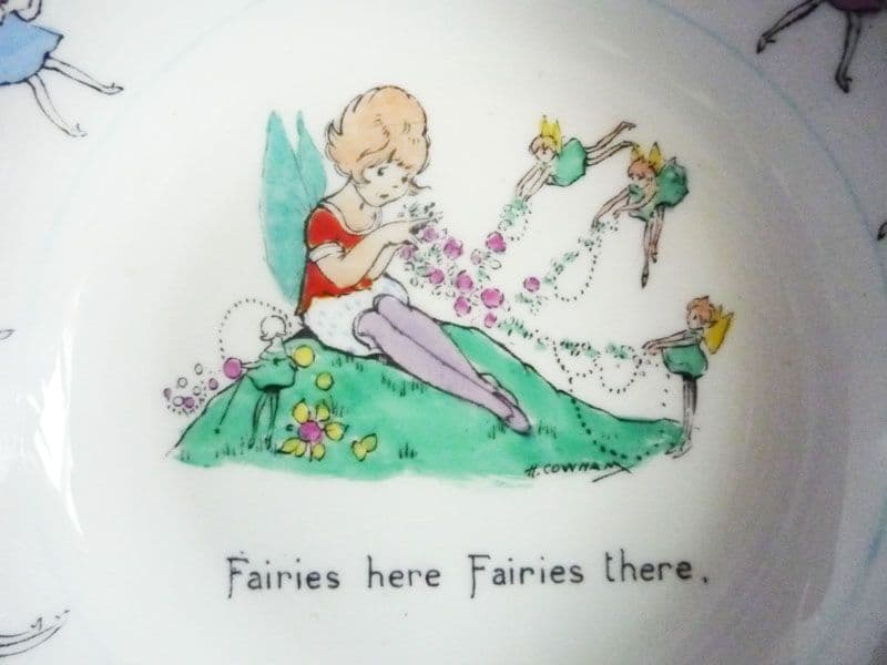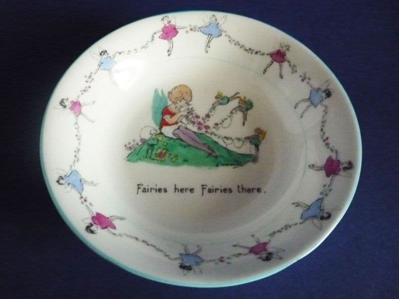 A lovely Hilda Cowham child's bowl designed for Shelley. Printed and hand enamelled with a little girl making flower garlands helped by fairies, the theme continued round the border with fairies holding garlands and painted blue trim. Bone china and in excellent condition; no chips, cracks, restoration or signs of wear or use. Hilda Cowham pieces are rare to find, especially in such good order. Signed 'Hilda Cowham' to the front, with 'Shelley China, England' and registration number 709690 (the first series of her designs introduced in 1924) to the back. Diameter 13.5cm (5.3in)