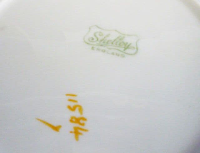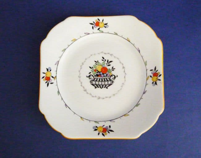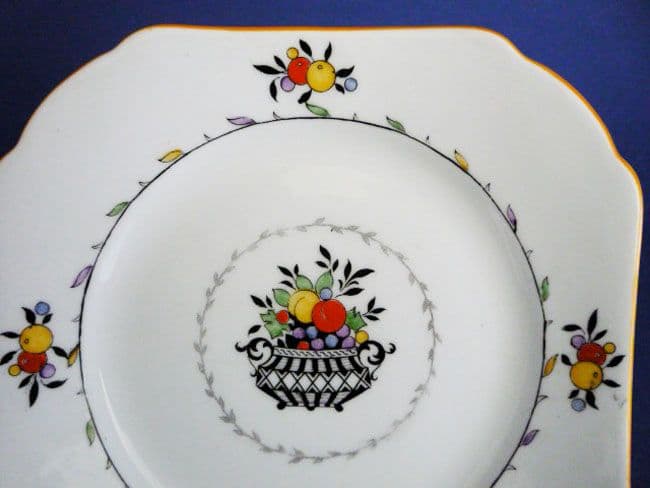 A precursor of the Queen Anne shape, these plates were used to accompany Lomond, Vincent and other 1920s tea cup shapes. A stylish design of a black urn or basket filled with enamelled fruit. There is a delicate inner border of enamelled leaves, and the rim has four enamelled sprigs of fruit. Yellow/orange enamel trim. In excellent condition. Green Shelley mark with painted pattern number 11584. Width 14cm (5.5in)