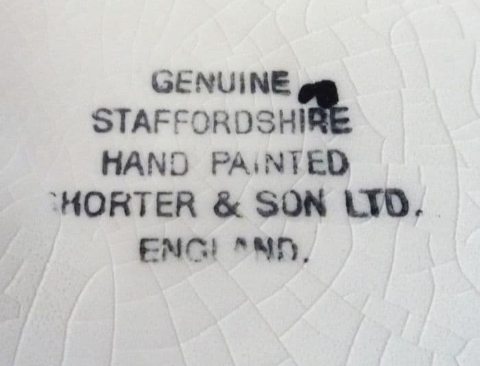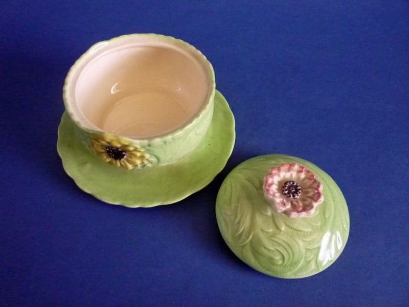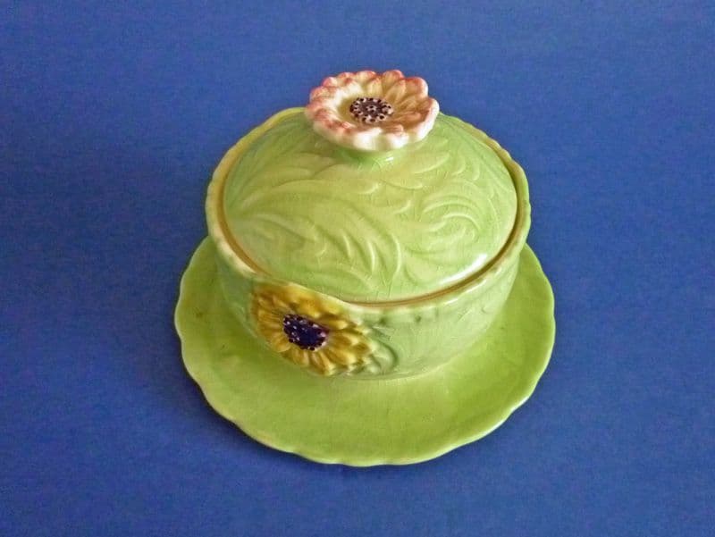 A lovely 'dahlia' butter dish and cover by Shorter and Son. Hand painted flowers in pink and yellow on a green ground. In excellent condition; no chips, cracks or restoration. Some mild age related crazing typical of these wares and nothing to detract. Rare to find, especially in such good order. Marked 'Shorter and Son'. Diameter of base 14.5cm (5.7in)