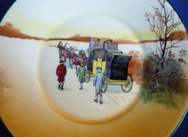 A small teaplate size Royal Doulton rack plate depicting the coach (yellow version) going up hill with attendants walking alongside. Designed by Victor Venner (fl.1904-24). Bone china series number E3804. An unusual shape to find in this size and in excellent condition. Lion, crown and circle mark and impressed date for 1927. Diameter 16.5cm (6.5in)