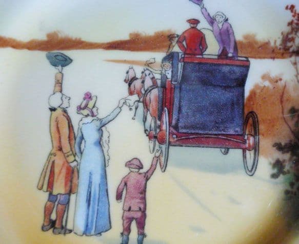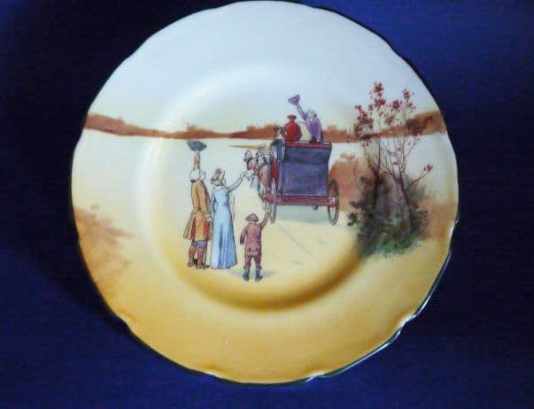 A small teaplate size rack plate depicting a family waving goodbye to the coach (red door). Designed by Victor Venner (fl.1904-24). Bone china series number E3804. An unusual shape to find in this size and in excellent condition. Lion, crown and circle mark with painted series number and impressed date. Diameter 15.5cm (6.1in)